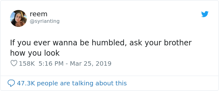Most siblings love each other unconditionally, yet that doesn't prevent them from teasing and annoying each other as much as they can. This is exactly what happened when Twitter user Syrianting suggested that "If you ever wanna be humbled, ask your brother how you look". Her tweet instantly went viral with sisters publicly sharing the responses they got. While some of the brothers were totally wholesome, others used this as a wonderful opportunity to tease and annoy their sisters. Scroll below for the most hilarious replies!