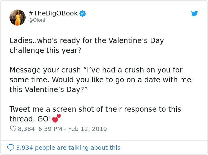 The next challenge to go viral is the Valentine's day challenge, started by London-based author and podcaster Oloni. She asked ladies to confess their feelings to their secret crush and ask them out on the first date for Valentine's day. Because sometimes we all need a little push to get out of our comfort zones, don't we?