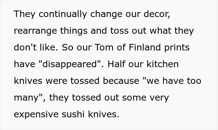 Load More Replies...No excuse for throwing out things or the "gardening", but Tom of Finland prints are pretty intense for polite company and I am gay. Still, if I was in a hard place and someone was letting me live with them, I probably wouldn't even say anything.