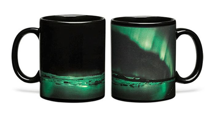 The northern lights are no longer the dominion of cold-blooded Canadians or Japanese tourists trying to have a lucky baby: effective immediately, Think Geek is bringing aurora borealis to your breakfast table in the form of a 12oz, thermal-sensitive, mug. Fill the mug with hot java, and watch the skies light up!