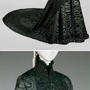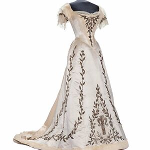 Gown Worn By Queen Victoria Of Sweden, Made Of Silk Satin, Decorated With Silver Thread Embroidery, And Pleated Tulle, 1906. Statens Historiska Museer
