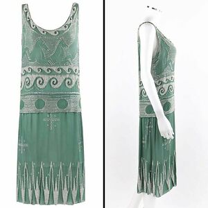 "Little Horses" Flapper Dress, Made Of Soft Green Silk Crepe Fabric Cut On Bias, Decorated With White Glass Beads In A Grecian Style, Designed By Madeleine Vionnet In C. 1924