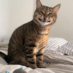 I'm 32" long from the tip of my nose to the end of my tail. My skin & fur coat are black & white. I have huge yellow eyes with long thick lashes. My nose & tongue are blood red. I'm extremely vocal & a primal hunter. I love raw, bloody meat & sour cream...& the loving, warm lap of MY human.