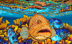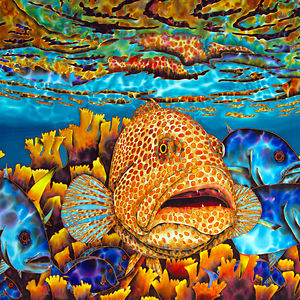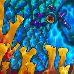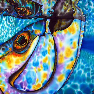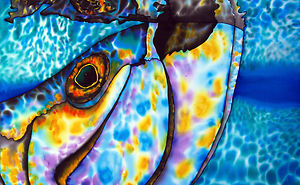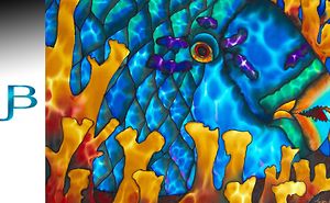 Daniel Jean-Baptiste is a Caribbean artist of Dutch Jewish, African Kalinago Carib descent who resides in St. Lucia and Canada. His art focuses on underwater scenes, game fish and their prey, tropical botanical themes, and exotic animals. He was inspired by his childhood spent fishing in Choiseul and hopes to bring attention to the beauty of his island home through his artwork. He uses 10mm Habotai silk as his canvas and is the originator of the shimmering light water technique, which involves painting with liquid paints on wet silk using Sumi bamboo brushes. The finished product is water-resistant and vibrant due to the translucency and natural luster of the silk.