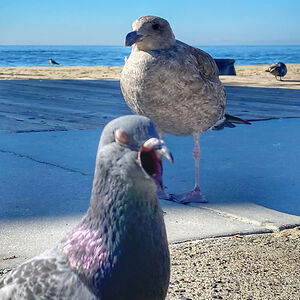 I Was Trying To Take A Picture Of This Juvenile Seagull And This Sleepy Pigeon Waddled In And Stole The Show