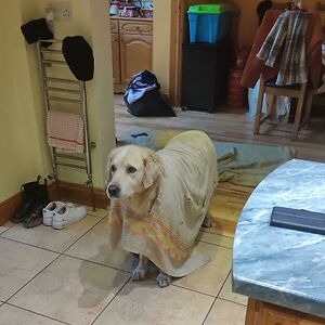 My Dog Chewed A Hole Through His Towel And Stuck His Head Through It. Now He Wears It Around The House Like A Poncho