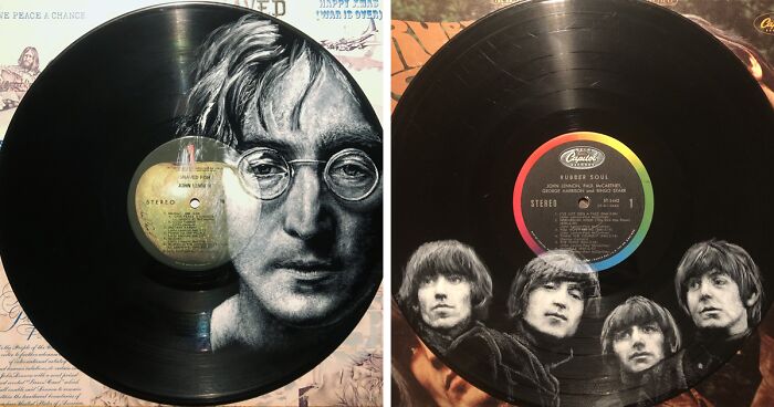 Gather and see the music with portraits of musicians painted on vinyl records