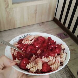 Strawberry pasta. Basically just pasta with strawberry sauce on top. My favourite is with frozen strawberries; you just blend them with sour cream, add some sugar, and pour that on the pasta. It's yummy, especially when it's a hot summer day and the pasta is warm but the sauce is cold.