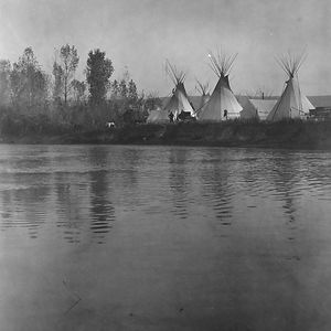 Crow Encampment With Tipis, Tents, Wagons, Horses And Men As Seen From The Distant Shore Of The River, 1908