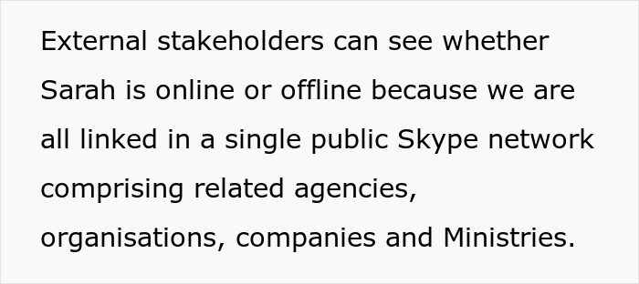 Sarah, apparently, was offended by this decision, and therefore discussed it with her colleagues for a long time, trying to find out what they thought about it. And so strange things began. The OP noticed that on days when Sarah worked from home, her Skype status was often “away” or “offline” during business hours.