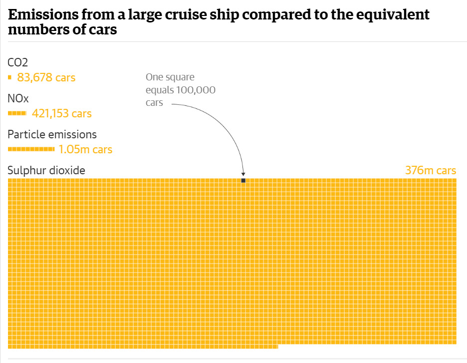 I think I you got your maths wrong. My focus can do 4.6 l/100km. Over 60mpg at slightly more then 70mph. And don't forget the XXI century slavery that goes on on cruises liners. 12 hour days 7days a week for 300 USD. I've done subcontract work several when they were in Barcelona or Málaga so I know what I'm talking about.