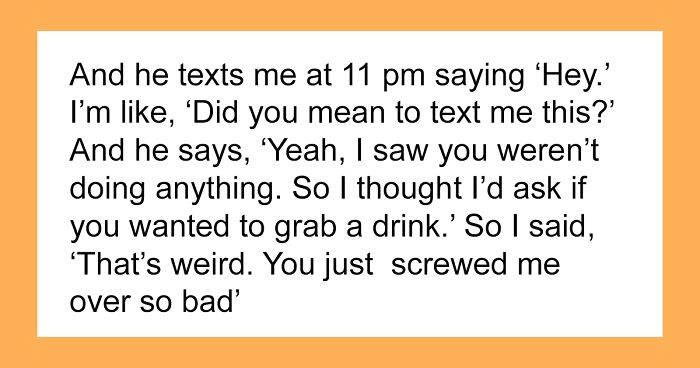 So I move on. The next weekend, I post on my TikTok story that I’m not doing anything that night, I don’t have plans. And he texts me at 11 pm saying ‘Hey.’ And I wait till the morning to respond. I’m like, ‘Did you mean to text me this?’ And he says, ‘Yeah, I saw you weren’t doing anything. So I thought I’d ask if you wanted to grab a drink.’ So I said, ‘That’s weird. You just screwed me over so bad.’