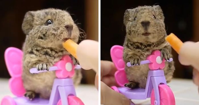 Meet JellyBaby, a tiny guinea pig that likes to consume calories and burn them on her tricycle at the same time. She is part of the crew over at Fuzzberta & Friends, an Instagram page of probably the most adorable guinea pig crew on the internet!
