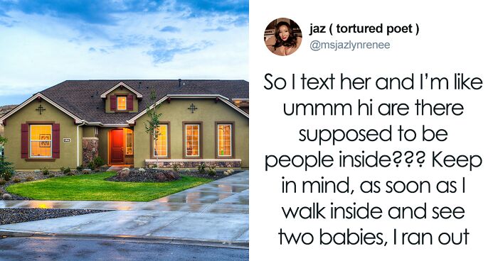 In this story, X user msjazlynrenee told netizens about how she entered a stranger’s house. So, she’s a dog-sitter who went to a client’s house, whose address the client had shared. She put in the code and really freaked out after entering the house. Because in the house that was supposed to be empty except for the dog, two babies were there, right in the living room!