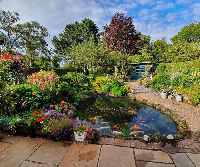 A stylish greenhouse instantly grabs attention in this blooming backyard. Along with aesthetics, the greenhouse also helps you garden all year. A south-facing greenhouse will catch ample sunlight, keeping the plants inside healthy. The seating area next to the greenhouse looks straight out of a fairytale, surrounded by the captivating colors of nature.