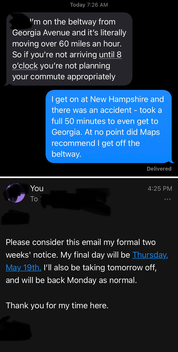 I don’t know about this one…think there might be some back story like traffic is used as an excuse frequently. And I don’t see how the boss was “so disrespectful”, if they’re on the same road and that’s their experience. Clearing up the location of the accident shouldn’t have been such a big deal.