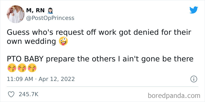 And recently, Twitter user @PostOpPrincess, who works as a surgical/trauma registered nurse, shared a post: “Guess whose request off work got denied for their own wedding. PTO BABY, prepare the others, I ain't gone be there.” The post went viral, amassing 11.4K retweets and 245.7K likes, making more people share their stories of being denied paid time off at work. And it’s infuriating, to say the least.