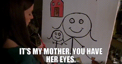 This reminds me of Not Another Teen Movie when Janey is showing her artwork and she draws her mother as a stick figure and Chris Evans' character is like, "you have her eyes." Found a gif of it attached lol. eyes-632c6...89a941.gif