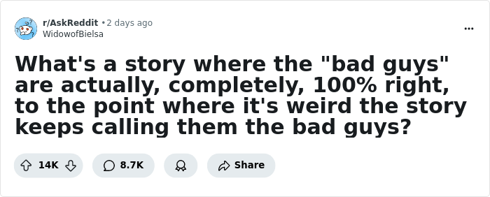 That brings us to today’s topic. A few days ago, a Reddit user went to r/AskReddit and asked: “What's a story where the 'bad guys' are actually, completely, 100% right, to the point where it's weird the story keeps calling them the bad guys?”