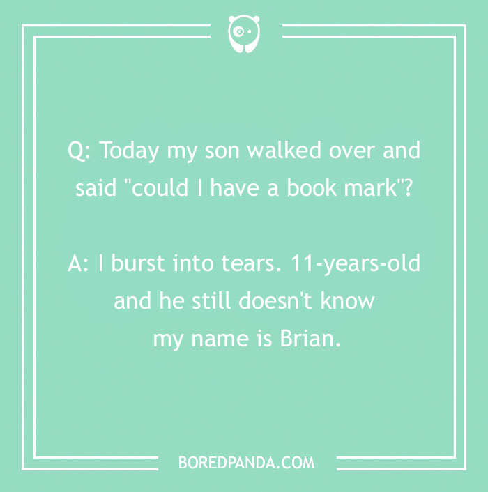Today my son walked over and said "could I have a book mark"? I burst into tears. 11-years-old and he still doesn't know my name is Brian.