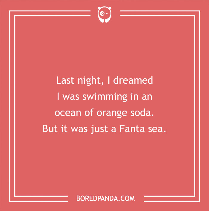 Pun about swimming in the sea I had a crazy dream last night. I dreamt I was swimming in a sea of orange soda. Turns out it was just a fanta-sea.