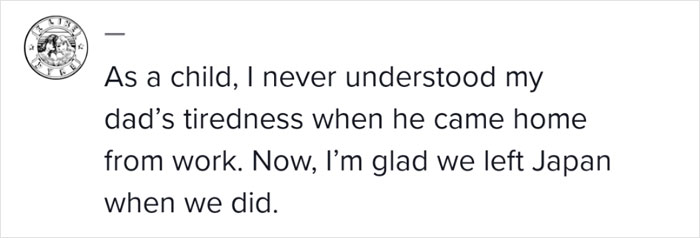 Load More Replies...One of the worst things I've seen in Japan is that when people get divorced, they make an immediate settlement, the wife gets the kids, and then the husband leaves and they never see each other or contact each other again. The father never sees his kids again. This was especially bad when an Australian neighbor of mine was getting a divorce, because he was also losing his visa status and would have to return to Australia and there was nothing he could do to convince his wife to let him see their children. He was really despondent at the time. Years later, I met his daughter by chance, though, and she told me she was still in touch with him, and would go to Australia sometimes to visit him. In Japan, this trend is changing as more people realize it's often better if the parents both continue to be part of the children's lives after a divorce.