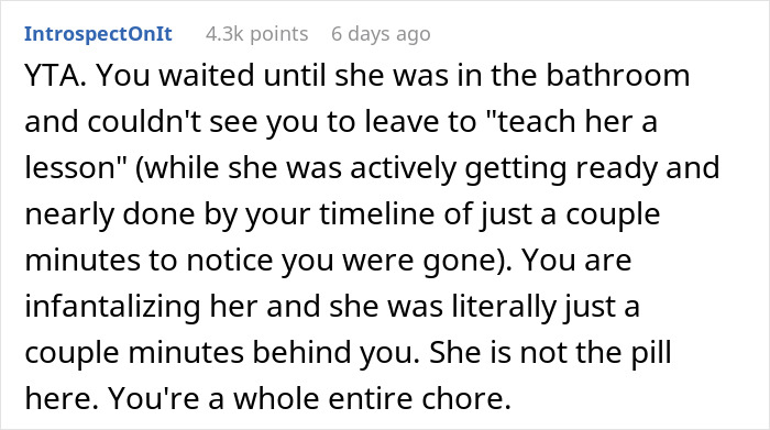 Load More Replies...You called her a narcissist and a pill. That is not how you speak about someone you are supposed to love, no matter how time blind she is. For this you are an arsehole. You didn't want to 'teach her personal responsibility'. You straight up punished her. For this you are also an arsehole.