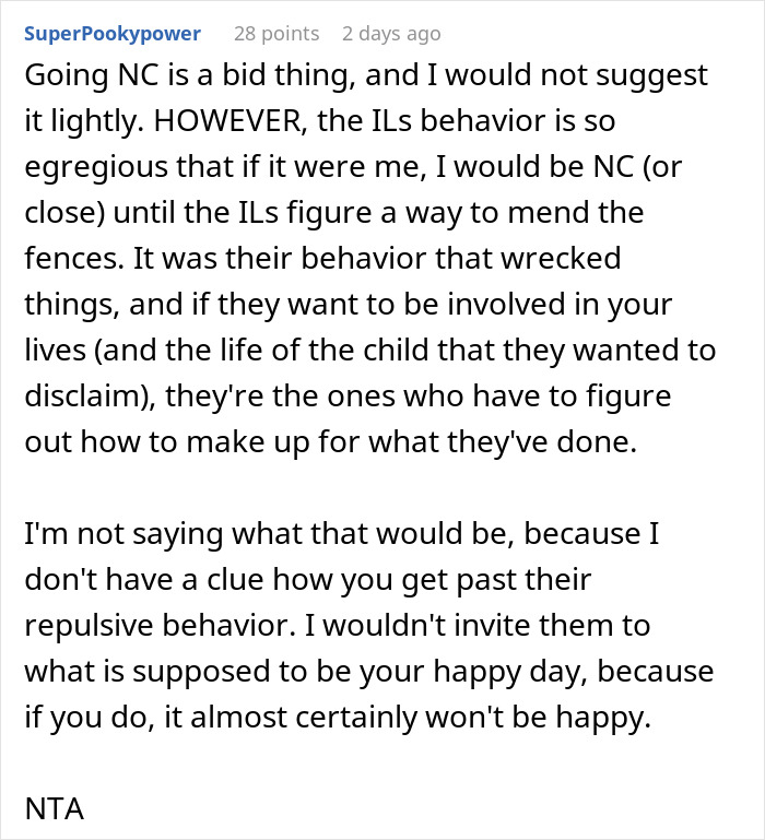 Load More Replies...MIL is a bad person and beneath you. So is FIL. On another topic: tell your husband for me that 2nd weddings are classless and a waste of money. I cut off a friend because she was acting like a Bridezilla for her second damn wedding to the same person. No, I'm not spending hundreds of dollars because you two couldn't get it together the first time.