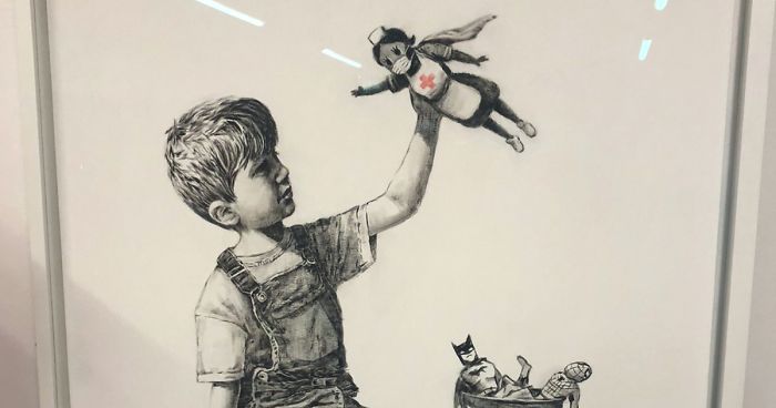 Banksy posted the artwork on his Instagram page with the title “Game Changer”, referring to the fact that the boy in the painting has ditched the traditional superheroes (such as Batman and Spiderman) in exchange for a new hero – nurse.