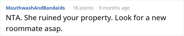 Some commenters were also outraged by the roommate’s statement that the OP’s being ridiculous about how she cares for her own pans. “She needs to grow up and learn to treat others’ belongings with respect,” the person in the comments notes. Moreover, some people even go further, advising the Original Poster to be more careful in choosing her roommates. “She ruined your property. Look for a new roommate ASAP,” one commenter summarizes.