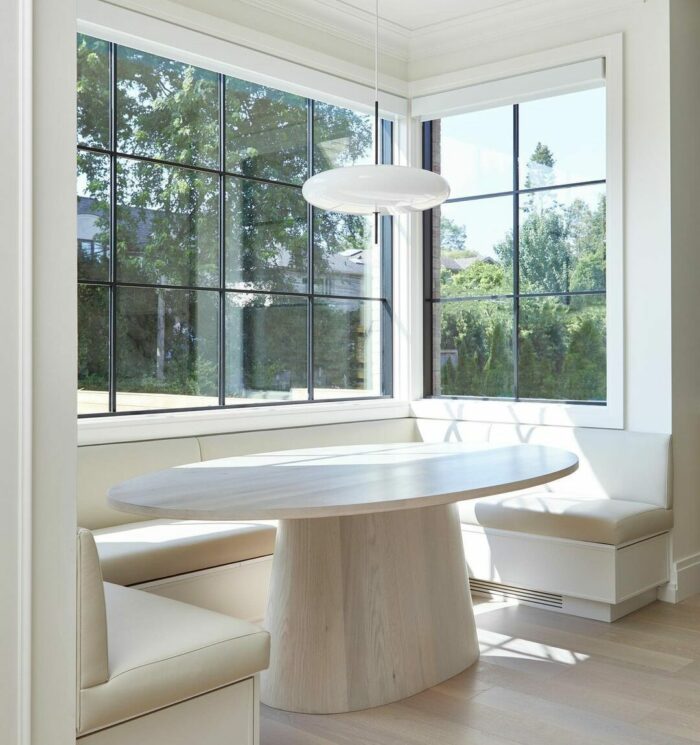 Place a rounded banquette that curves along with the towering bay windows’ structure. Enjoy the natural light and pleasant breeze as you eat meals, de-stress, or have long, refreshing reading sessions.