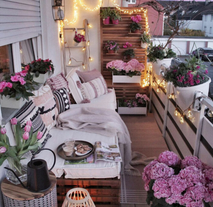 DIY a string lights canopy with seasoned outdoor lights for your balcony with a banquette. The light canopy will cocoon the balcony with a warm glow. Enjoy ravishing parties or drift off in dreamland on your lit banquette on the pleasantly breezy balcony.