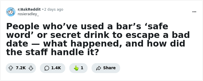 On today’s list, you will find plenty of examples of these safe words and secret drinks being used in actual situations, proving that they exist beyond theoretical discussions. All of these stories were shared by people online when someone on Reddit encouraged them to do so. And we’re glad they did—it’s not only interesting to read about, but it also shines a light on how important and useful such safety measures are.