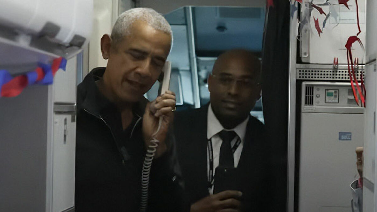The 64-year-old former President boarded the aircraft and spoke through the intercom, greeting passengers with a simple, “Hello, everybody.”