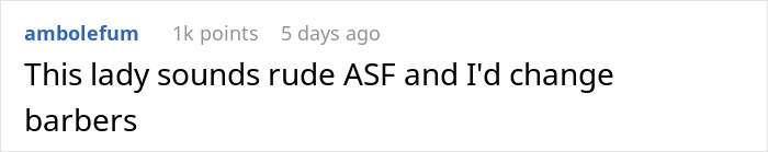 To gain more insight on this situation, we reached out to Reddit user Lazarus870 and asked what inspired him to share this story. “I just wanted to get to know other people’s opinions. I felt I was in the right, but perhaps I was the one who was wrong on etiquette,” he told Bored Panda. We were also curious how often he gets his hair cut, and he shared that he visits the barber every 3-4 weeks. And when it comes to whether or not this encounter has made him rethink who cuts his hair, he shared, “I think I’ll keep going. She’s so close!” We can’t blame him; convenience is king!