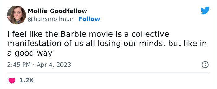 Tweet about the Barbie movie capturing collective chaos humorously.