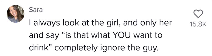 So Rise is really doing a good deed. However, not all commenters really agreed with this. One man even clarified that he gets charged for a double shot of tequila, and the woman ends up getting water when she really wanted some alcohol. To this, Rise noted that she always tries to read a woman’s body language, and wonders: “Is that what YOU want to drink?”