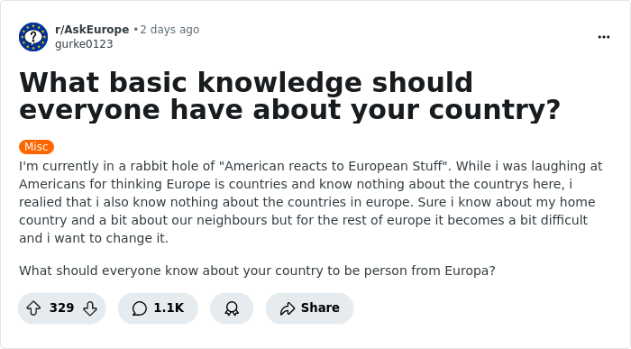 A few days ago, a thread appeared in the AskEurope community on Reddit, the author of which, the user u/gurke0123, admitted that despite the fact that Europeans sometimes laugh at Americans who know nothing about Europe and the countries there, Europeans cannot necessarily boast of extensive knowledge either.