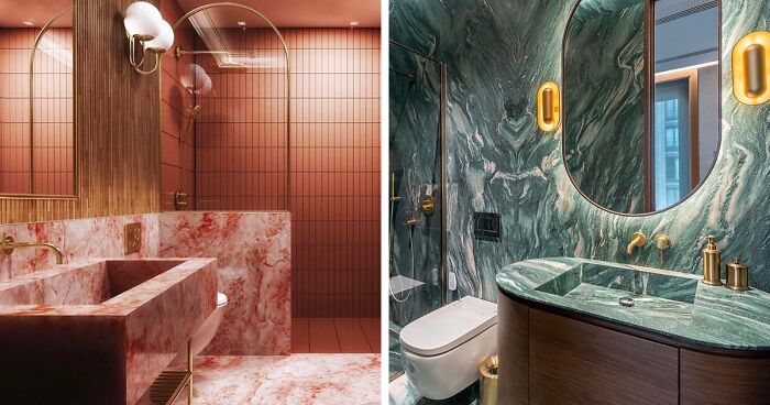 “Green marble is that daring pattern you are looking for. Saturated, strong, expressive, and full of life, your bathroom will look like a ballroom or a bank hall, which is appropriate if considering the costs. I’d go with simple white furniture and intricate mirrors for a top-notch bathroom,” says Endri.