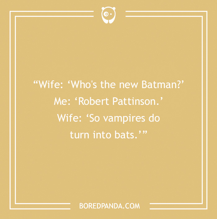 “My friend said, ‘Do you want to hear an excellent Batman impression!?’ I said, ‘Go on, then.’ He shouted, ‘NOT THE KRYPTONITE!’ I said, ‘That’s Superman.’ He said, ‘Thanks man, I’ve been practicing a lot.’”