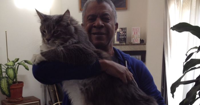 BB King is now six years old and weighs 26 pounds. He is a purebred blue/white Maine coon and owns my heart. His father was a Blue and weighed 35 pounds, his mother was a 14-pound Tabby.