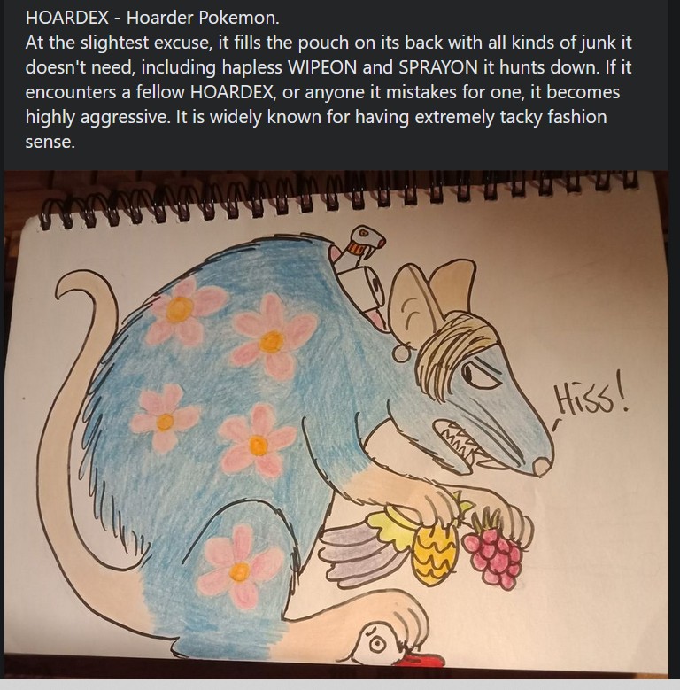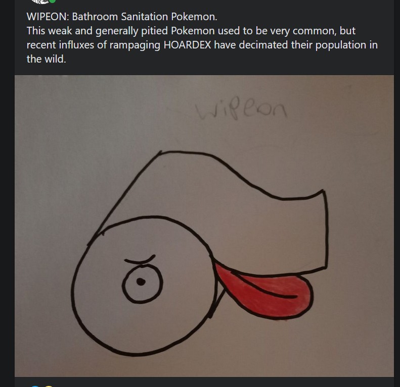 Load More Replies...I also teamed up with a friend to create new Pokemon designs, many of them pandemic themed. So that was fun. My favourites were Hoardex and Wipeon. Here's Hoardex, the Hoarder Pokemon whose favourite prey is Wipeon, the Toilet Paper Pokemon. Hoardex-Te...dc80d9.jpg