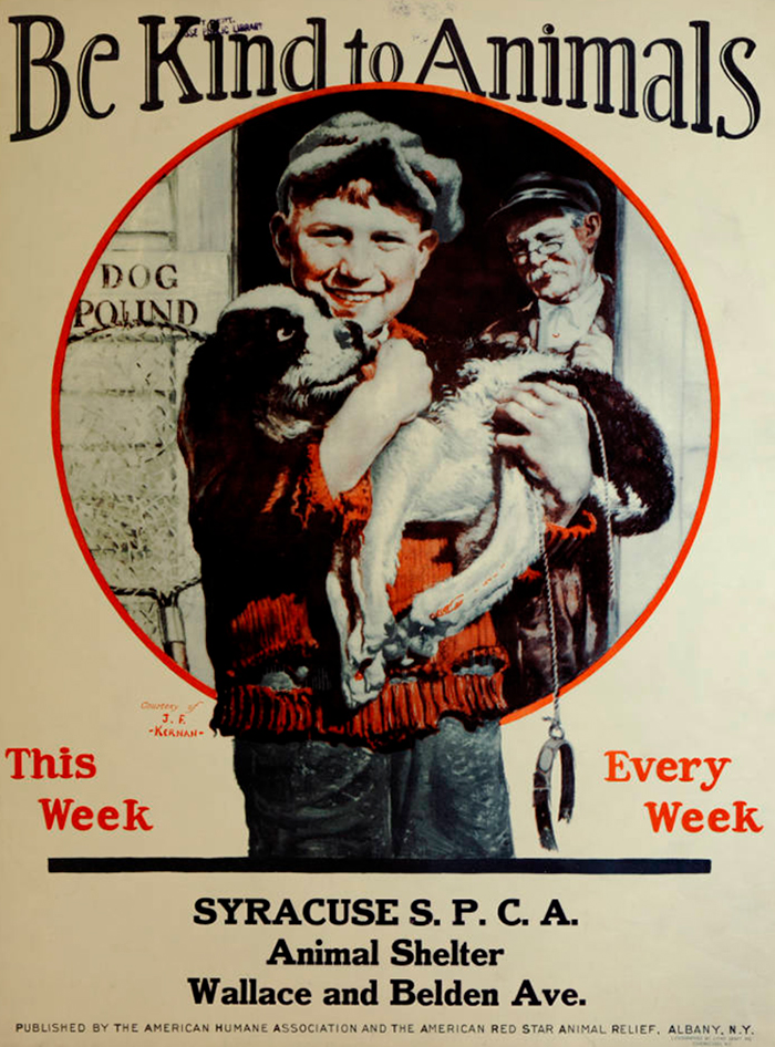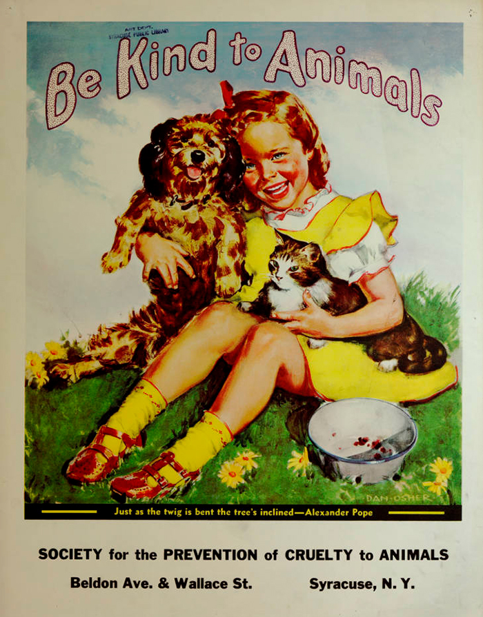 During the 1930s, the American Humane Association organized a "Be Kind To Animals" week where they shared posters of people taking care of animals. These adorable posters used artist's Morgan Dennis' work who was already known for his drawings, particularly of dogs. Each poster had an illustration of a charming child shown taking care of an animal. The main goal of the posters was to spread the message that people should love and respect animals.