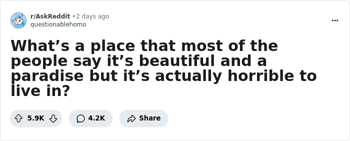 However, tourists and locals often see places from polar opposite perspectives. The former need restaurants, beaches, and a forgiving currency exchange rate, while the latter are more interested in hospitals, schools, and job opportunities. To explore the mismatch further, let's take a look at a Reddit thread where people have been listing cities, countries, and regions that are beautiful to visit but not to live in.