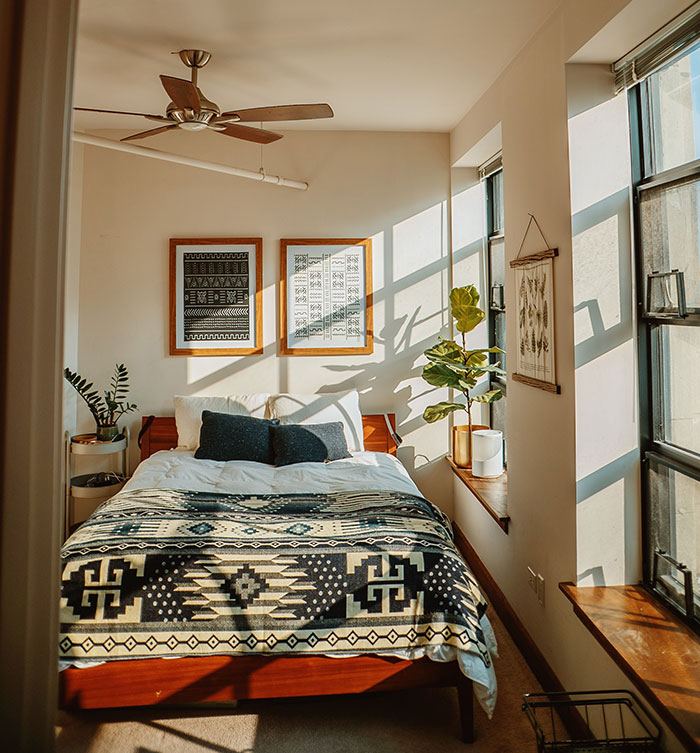 This is the easiest way to add texture to the walls. Mix shapes and patterns to give your bedroom dimension. You can complement the look with a boho rug or runner.