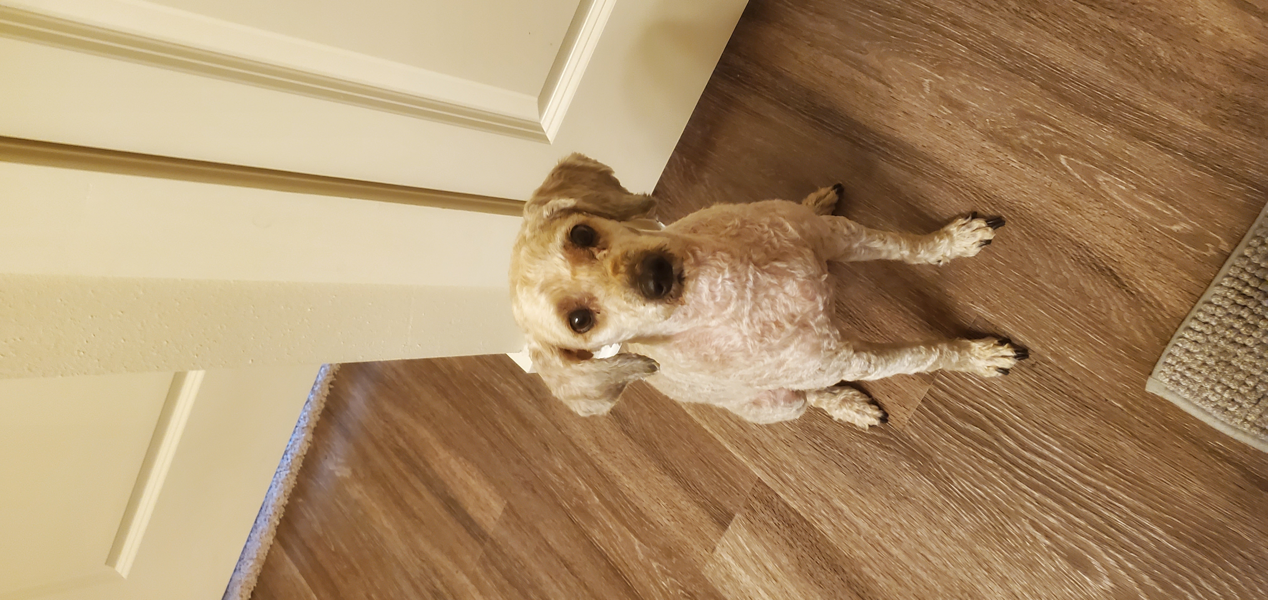 Scout, a girl-scout, is our dog. She is a boooodle. That’s right, four letter o’s in a row. Why? She is 7/8 poodle and 1/8 bulldog. She her breed is 8 letters long, with 7 letters representing 7/8 of her source code,and 1 letter representing 1/8 (‘b’ is for bulldog).