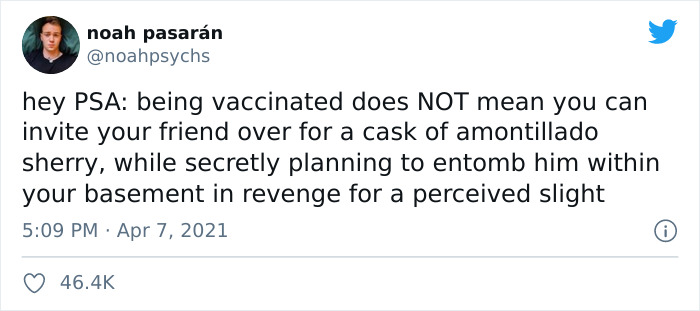 “Hey PSA: being vaccinated does NOT mean you can invite your friend over for a cask of amontillado sherry, while secretly planning to entomb him within your basement in revenge for a perceived slight.”