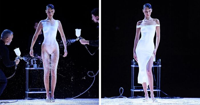 Bella Hadid, the 25-year-old supermodel, turned heads as she walked out in the nude, covered by only a nude thong. She stood on an illuminated pedestal where two men took to crafting a pure white dress right on her body.