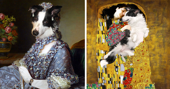 I know this kind of work has been done before with both animals and humans, but I am doing it mostly for my own pleasure nowadays, and hoping to help Dog charities in the future (maybe calendars, cards, stickers?). The hardest part for me when doing this kind of work is to adapt a new photo to the textures and atmosphere of an old painting. Or, for example, to make Bella’s paws play an instrument. It is not simply a “collage”, but feels like a new composition (to me at least!) in the sense that I have to work the photo (or photos, since I use more than one generally) along with the original painting, so these two media look as seamless as possible, consistent in light and finishing.