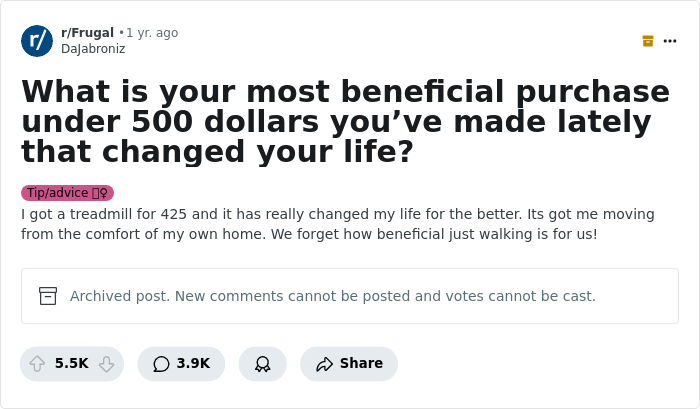 Well, folks, that's it from our end, so we hand over the platform to you. Don't forget to upvote the things you could relate to the most. Also, we would love to hear about the beneficial purchases under $500 that changed your lives. Feel free to jot them down in the comments!